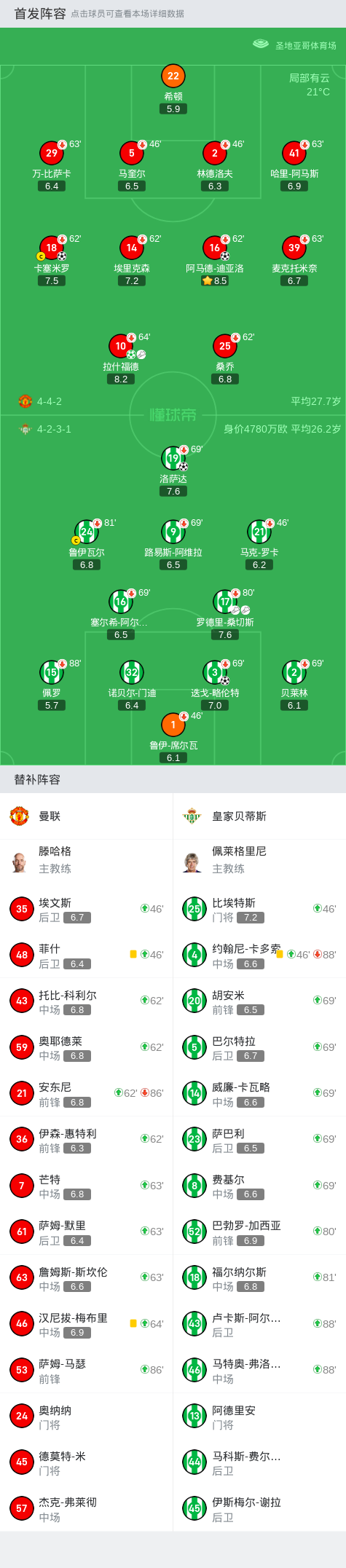 下半场比赛开始,曼联依旧保持着强势的表现。然而,第61分钟,皇家贝蒂斯在罗德里-桑切斯的助攻下,迭戈-略伦特头球破门,将比分缩小为2-3。曼联的防线有些犹豫,为对手制造了一定威胁。