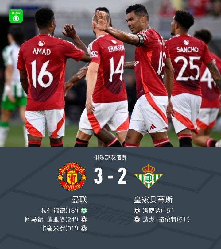 在比赛结束前的最后时刻,两队球员都展现出了顽强的拼搏精神。然而,最终曼联以3-2的比分战胜了皇家贝蒂斯,取得了本场友谊赛的胜利。整场比赛节奏明快,精彩纷呈,令人目不转睛。