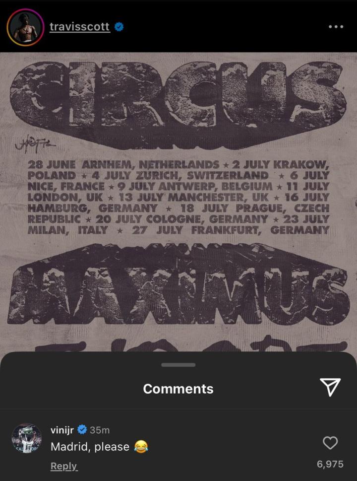 昨晚的马德里,音乐与足球的两大热门领域交汇,Travis Scott的演唱会上,出现了一位意外的嘉宾。皇家马德里的年轻球星维尼修斯被邀请上台与Travis Scott共同演出,这个跨界合作立即引起了现场粉丝们的热烈反应。这似乎也验证了维尼修斯五月份留言的预言,让Travis Scott来马德里开演唱会的愿望成真。